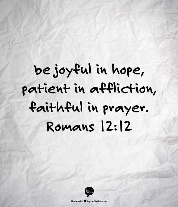My particular downfall is depression, and so joy and hope are definitely my goals. How to be joyful in hope? What does that look like? Knowing I have hope: ultimately my life is in God’s hands and he is strong enough to deal with whatever comes my way. Also that this is a momentary trouble. It has an end point, at which time I will feel better. So I can keep that hope in mind, and cheer myself with the thought.
