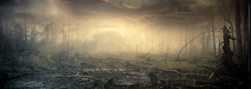 He moved as quickly as he might, though the uneven ground and the shrouding mist made progress slower than he would have liked. Soon more and more shapes materialized in the white void. Trees—or what had once been trees. They stood tall, still, but leafless, even branchless, and black. Charred.